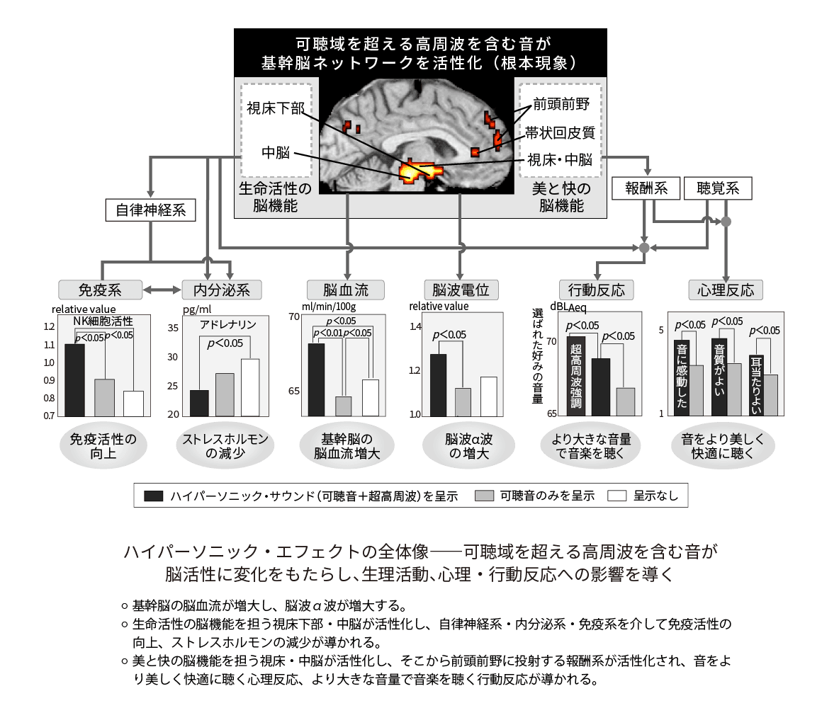 ハイパーソニック・エフェクトとは、人間の可聴域上限をこえる超高周波成分を豊かに含み高度に複雑に変化する音が、基幹脳――脳幹・視床・視床下部など、美しさ・快さ・感動を司る報酬系の拠点となるとともに体の恒常性や防御体制を司る自律神経系・免疫系・内分泌系の最高中枢をなす領域――を活性化する現象に基づく複合的な心身賦活反応の総称です。 それは、領域脳血流の増大、脳波α波の増強、免疫活性の上昇、ストレス性ホルモンの減少、音のより快く美しい受容の誘起、音をより大きく聴く行動の誘導などに及びます。 こうした効果をもつ音――ハイパーソニック・サウンド――は、人類の遺伝子が進化的に形成された熱帯雨林の環境音や邦楽をはじめとする民族音楽の中に見出されています。また驚くべきことに、耳に聴こえない超高周波振動を感受しているのは、耳ではなく体表面であることも明らかになっています。