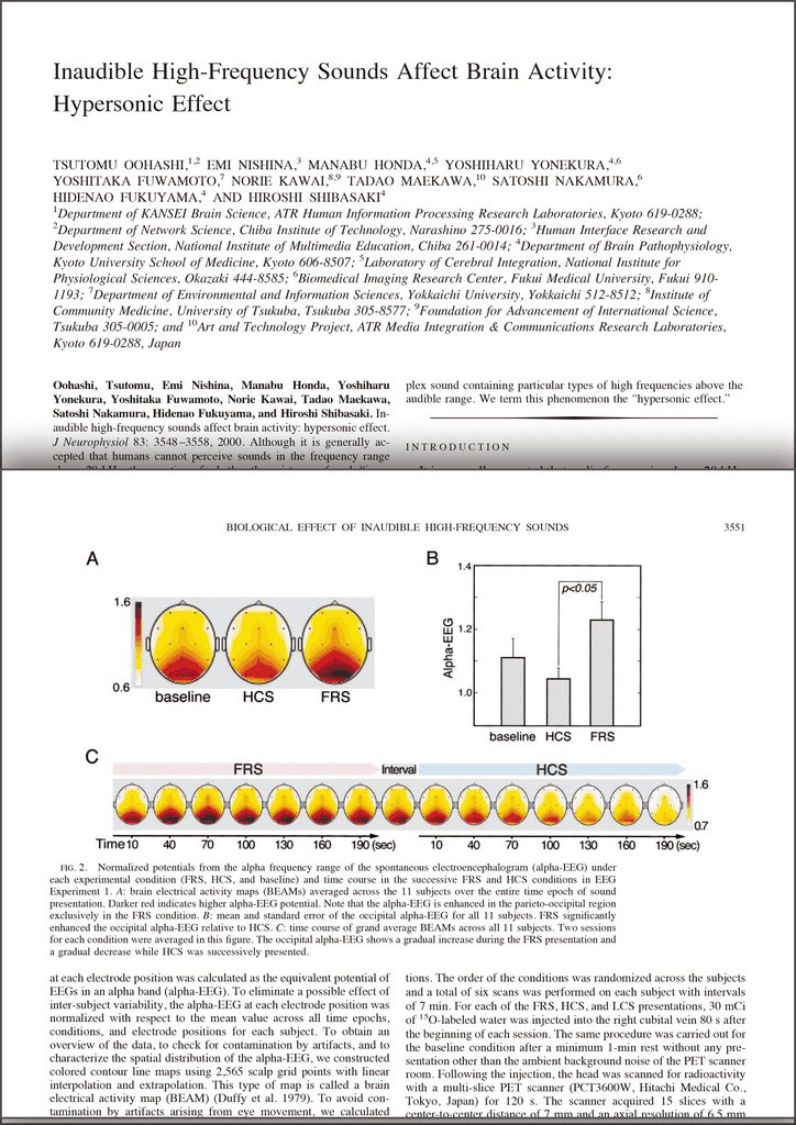 ハイパーソニック・エフェクトの発見を告げる論文「聴こえない高周波音が脳の活性に影響を及ぼす=ハイパーソニック・エフェクト(Inaudible High-Frequency Sounds Affect Brain Activity: Hypersonic Effect)」は、2000年6月に、アメリカ生理学会の公式論文誌として百年近い伝統を誇る基礎脳科学分野でもっとも権威ある論文誌Journal of Neurophysiology (JNP)に発表されました。同誌では、過去の一万報を超える全掲載論文から毎月、「その前の1か月間にインターネットで講読された回数の多い論文ベスト50」を集計・公表し、そのうちトップ5のタイトルと著者名をそのトップページに掲げます。いわゆる「引用数」が関連分野に限定されるのに対して、このデータは、ずっと広範囲の世界の科学者たちの注目度を全般的に押さえうる点が評価されています。 ハイパーソニック・エフェクト論文は、2003年12月以来、このランキングのトップ5に55ヶ月間連続でランクされ(2008年6月時点)、うち第1位が24ヶ月に及ぶ、という前人未踏の大記録を樹立しました。